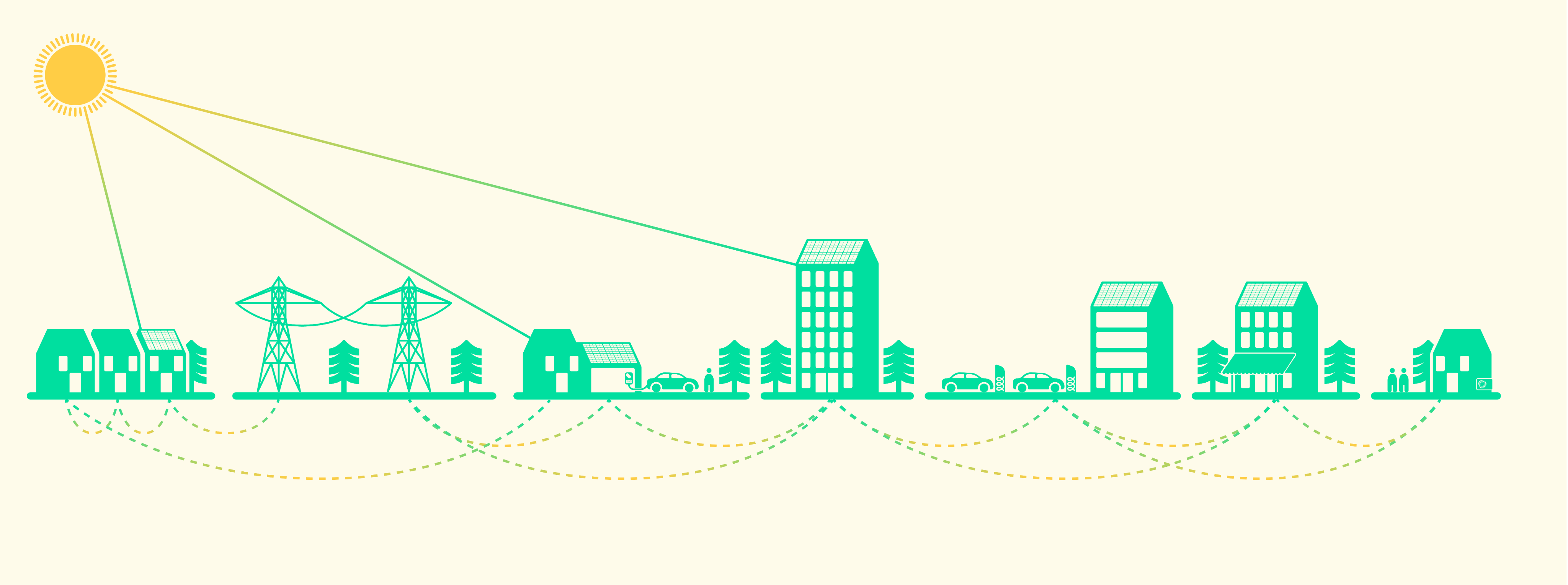 Excess solar power from private photovoltaic systems is shared directly within the community, providing fair compensation for producers and lower costs for consumers.